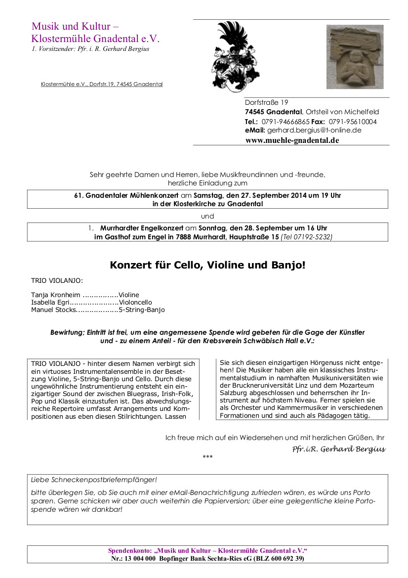 Klostermühle Gnadental e.V.“ IBAN: DE92 6006 9239